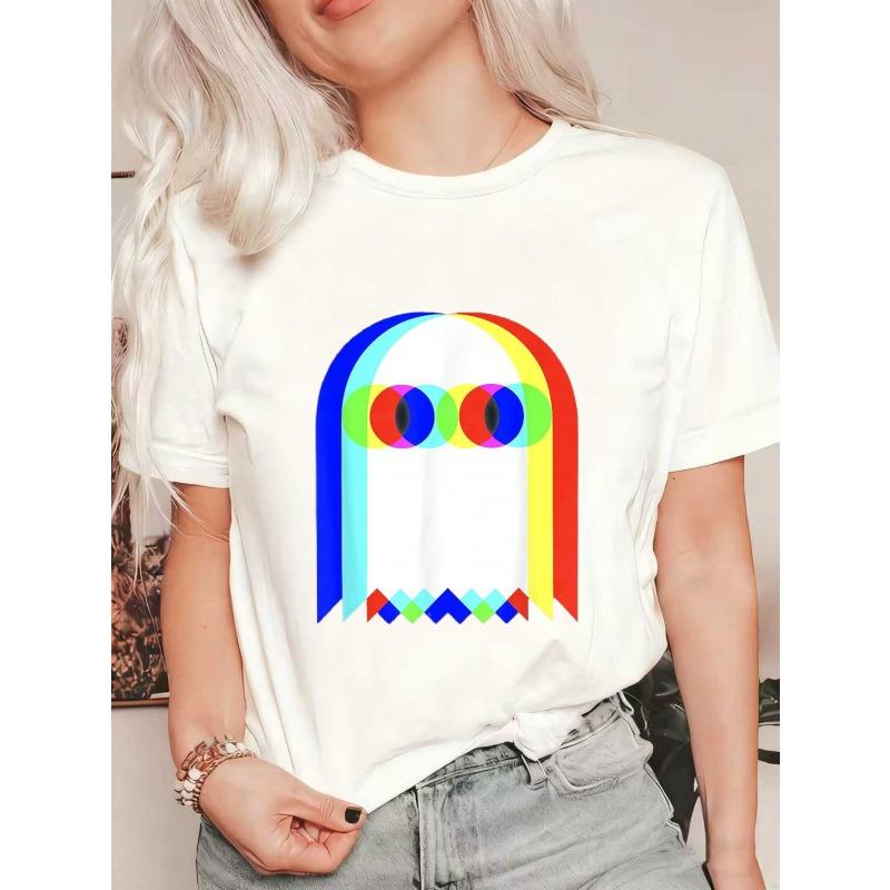 Oversize Women's Short-Sleeve T-Shirt with Rainbow Gradient Ghost (with Colorful Ring Eyes) Print