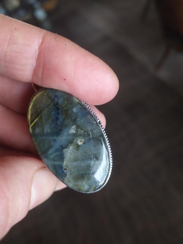 Ein wunderschöner Anhänger. Der Stein ist viel erdiger grün als auf dem Präsentationsfoto, undurchsichtiger und mit feineren Rissen. Darüber hinaus ist Labradorit ein undurchsichtiger Stein, nicht transparent wie Amethyst, Citrin, Quarz usw. Es kam in 5 Wochen gut verpackt an.