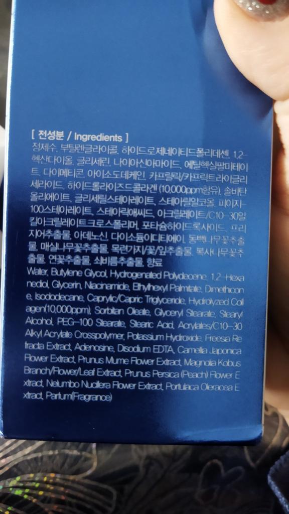 (Emulsion)Purified water, butylene glycol, hydrogenated polydecene, 1,2-hexanediol, glycerin, niacinamide, ethylhexyl palmitate, dimethicone, isododecane, caprylic / capric triglyceride, hydration Rolled collagen (containing 10,000 ppm), sorbitan oleate, glyceryl stearate, stearyl alcohol, PEG-100 stearate, stearic acid, acrylate / C10-30 alkyl acrylate crosspolymer, potassium hydroxide Side, freesia extract, adenosine, disodium ID, camellia flower extract, plum tree flower extract, magnolia branch / flower / leaf extract, copy tree flower extract, lotus extract, purslane extract, fragrance