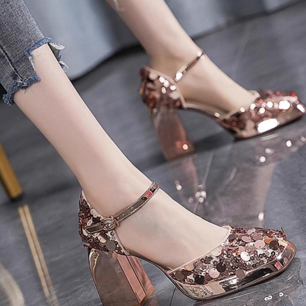 Internet celebrity sequins square head high heels women's 2025 summer new square heel one-word buckle socialite banquet dress single shoes