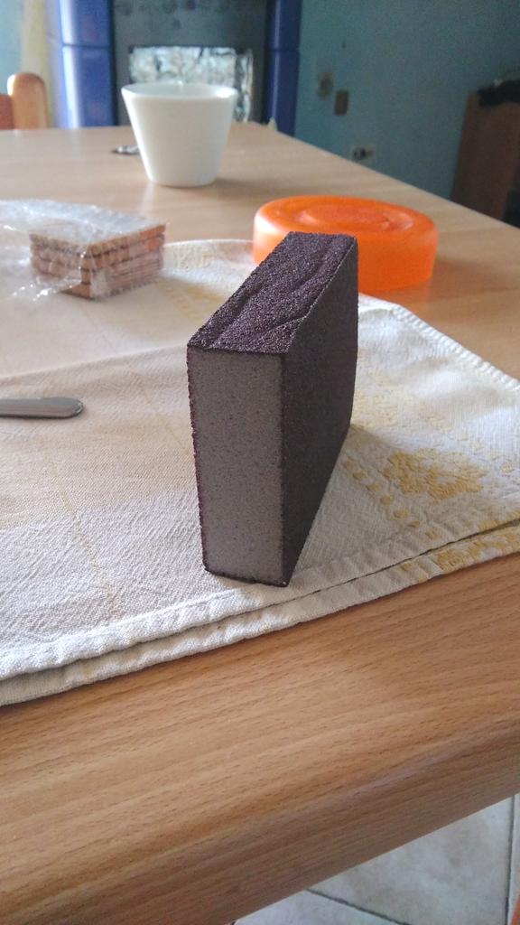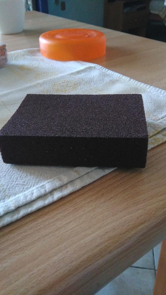 Spugna abrasiva di tipo comunemente venduto in ferramenta per scartavetrare il legno. Se volete graffiare e smerigliare l'acciaio lucido fate pure.