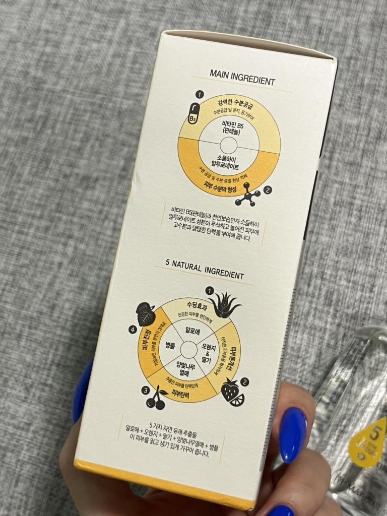 გაწმენდილი წყალი, ნატრიუმის ჰიალურონატი, გლიცერინი, გლიცერილის პოლიაკრილატი, ნიაცინამიდი, პანთენოლი, კლოფენეზინი, ეთილჰექსილგლიცერინი, ადენოზინი, დინატრიუმის EDTA, ბუტილენ გლიკოლი, ალოე ვერას ფოთლის წვენი, ცენტელა აზიატიკას ექსტრაქტი, მარწყვის ნაყოფის ექსტრაქტი 0, მარწყვის პოლიკაროს ექსტრაქტი 1,2-ჰექსანდიოლი, კაპრილილ გლიკოლი