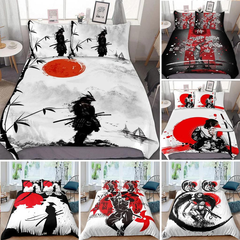 Japanese Samurai Bedding Set King/Queen/Full Size Japan Sunset Scenery Building Silhouette Polyester Duvet Cover Men Black Red