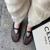 Leather hollow mesh sandals women's summer one-word buckle with round head flat bottom shallow mouth Mary Jane single shoes