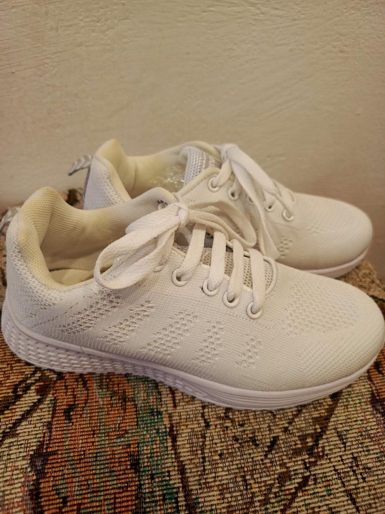 Взяла 40 размер на свой 39. Чуть свободны, но после того, как вложила пришедшую от Joom'a же стельку из пены, стало плотнее и удобнее. Не понравились неаккуратно заклепанные внутри каким-то металлом типа жести дырочки для шнурков, которые неприжатыми металлическими частями цепляют шнурки и носки. Пришлось пройтись молотком. Ждала почти месяц. Было интересно читать перечисление разных китайских городов, куда прибывала посылка. Так, ношу эти кроссовки. Пока все хорошо. Очень легкие. Яркий белый цвет. Легко пачкается. Наверное, можно потереть ластиком... Но есть подозрение, что накрахмаленная сетка перестанет стоять колом после попадания дождя на нее.
