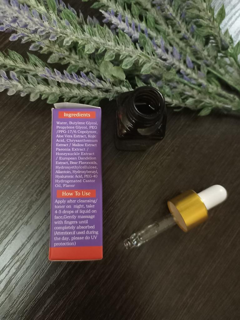 Койевая кислота. Сыворотка для лица с эффектом отбеливания. Объем 10 мл Срок годности 3 года. Бутылочка тёмного цвета. Откручивающаяся крышечка является еще и пипеткой, с ее помощью очень удобно набирать сыворотку. Главная ее задача заключается в выравнивании цвета лица и осветлении пигментных пятен, а также увлажнении кожи. Сыворотка прозрачная, по консистенции скорее жидкая, чем густая. Как применяю сывортку я: -oчищаю кожу от загрязнений -наношу сыворотку и оставляю до полного впитывания -далее либо приступаю к макияжу, либо на ночь наношу крем. Аллергии у меня сыворотка не вызывает, поэтому буду продолжать пользоваться. Сыворотка хорошо увлажняет кожу. успокаивает кожу, выравнивает её тон. Экономично расходуется, достаточно 2-3 капель на одно применение.