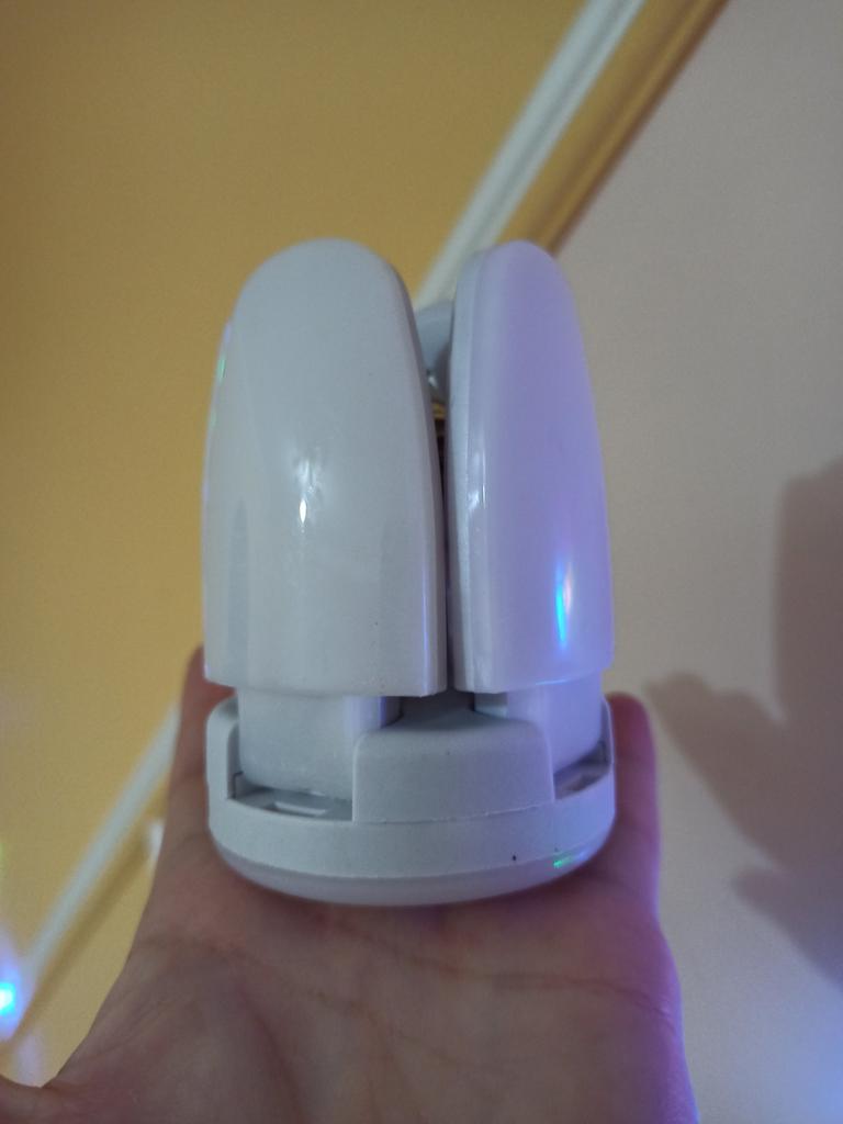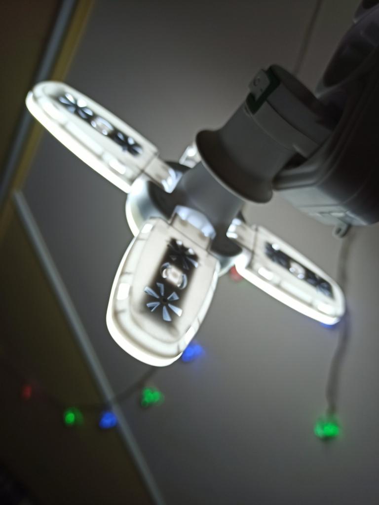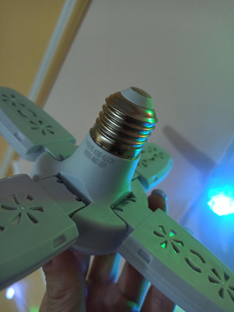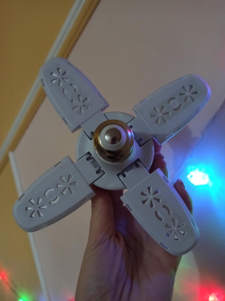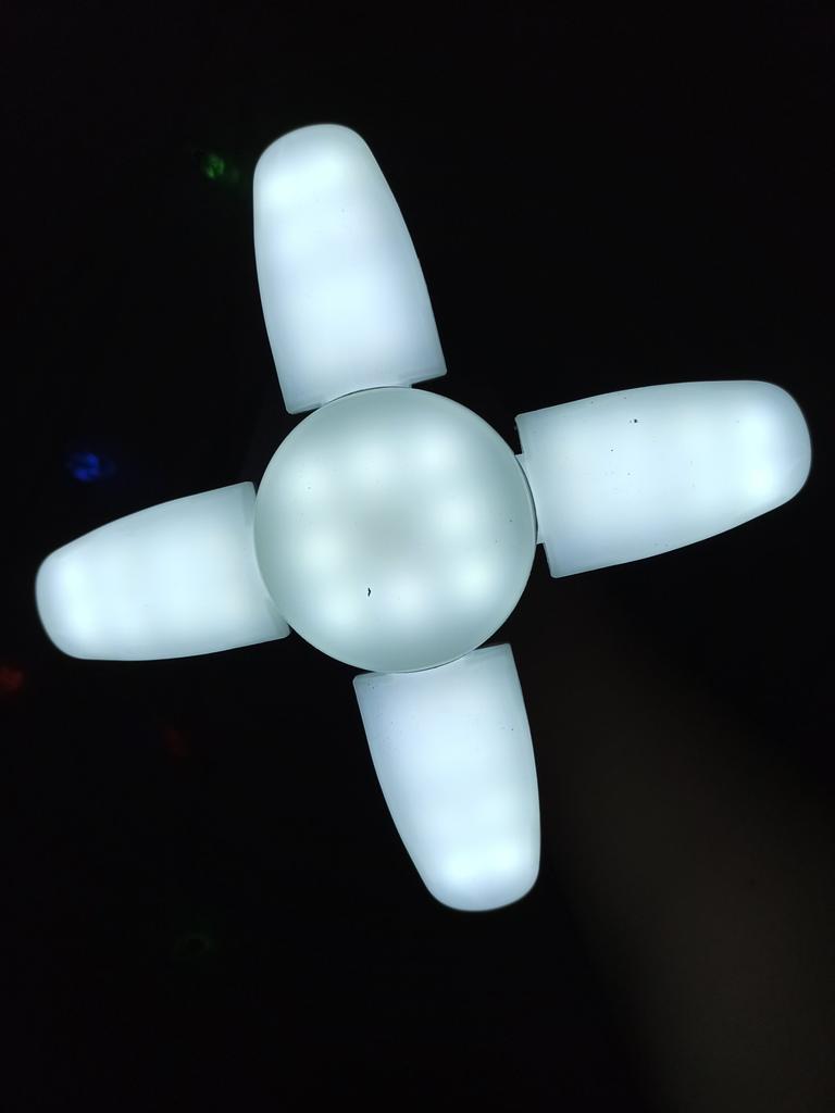 Яркая светодиодная лампа E27 Пришла лампа хорошо упакована, в соответствии с заказом. Мощность 165-265Вт. Хоть она и небольшая, но освещает очень хорошо. Светит белым Состоит из 5 светодиодный секций: 4 лопастей, которые складываются и раскладываются + 1 секция посредине. Имеет универсальный цоколь - E27, которой легко вкручивается в люстру. Также на коробочке написано, что время работы её - 60000 часов, надеюсь, что она столько проработает. Лампой очень довольна! Однозначно РЕКОМЕНДУЮ 👍
