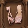 2025 New Summer French Square Head Thick with Pearl Flower Flip-flops Women Sandals Open-toed Flip-flops with Mid-heels Slippers